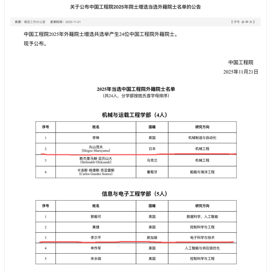 11月21日,2025年两院院士增选结果正式揭晓。中国科学院2025年共增选院士73名、外籍院士27名;中国工程院共增选院士71名、外籍院士24名。