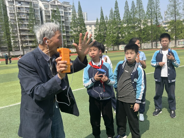 4月12日下午1点30,衢州市常山县实验小学操场上,83岁的杨民杰戴着耳机,拿着教具,为孩子带来一堂生动的无线电测向拓展课。