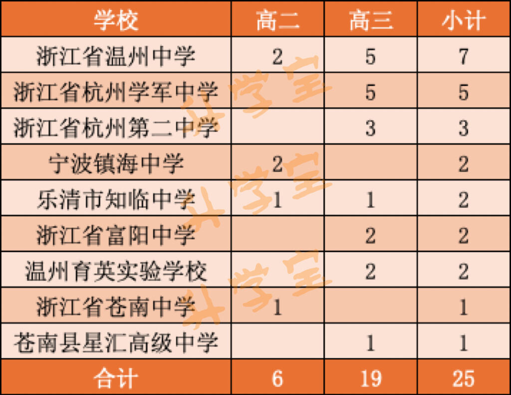 今年共有25名高中生入选省队,分别来自浙江省温州中学、浙江省杭州学军中学、浙江省杭州第二中学等9所学校。其中高二学生9人,高三学生16人。