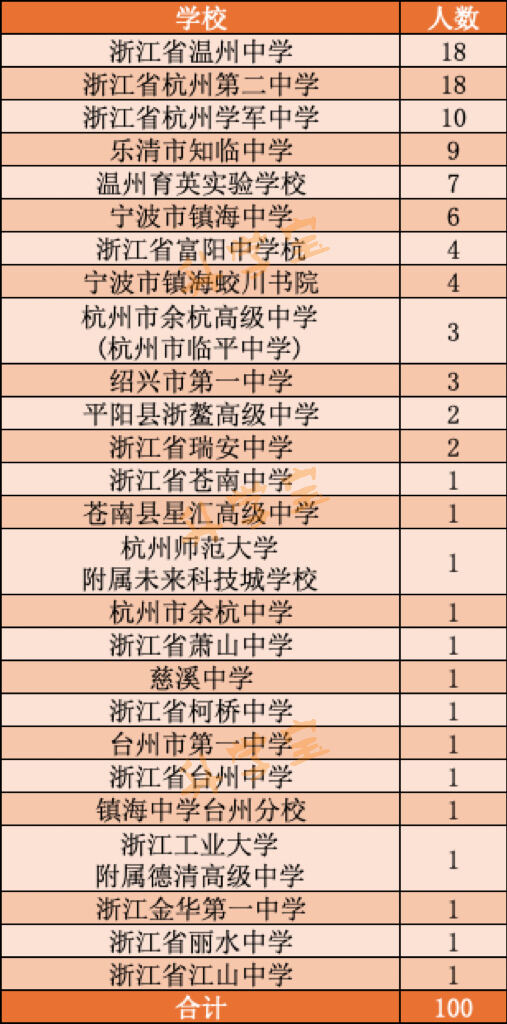 此外,浙江共有100名高中生获得一等奖,来自26所高中,其中获奖人数超过10人的学校有3所,浙江省温州中学和浙江省杭州第二中学分别有18人,浙江省杭州学军中学10人。