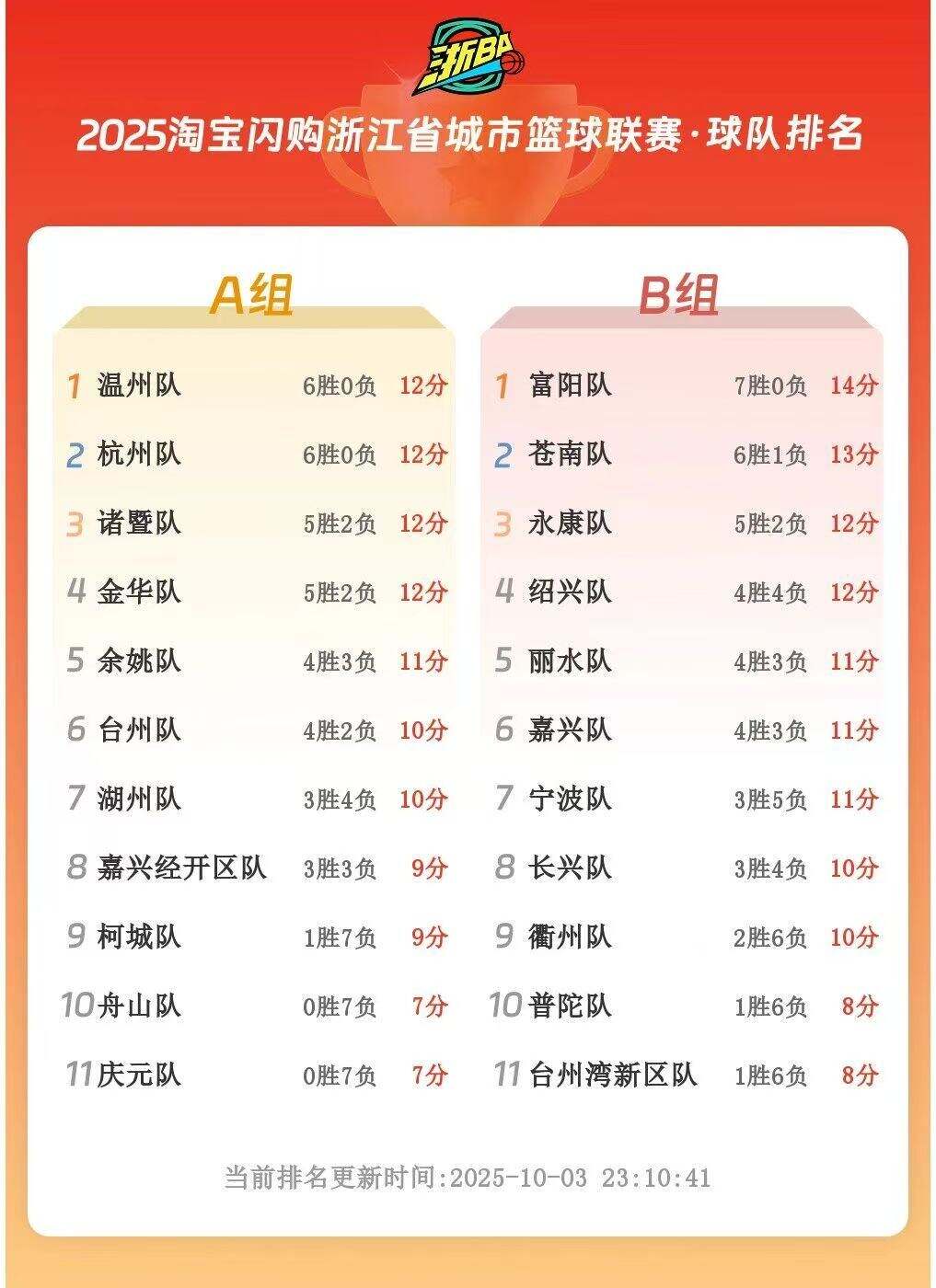 有趣的是,“杭温对决”的风也烧到了“浙BA”,根据最新积分榜显示,A组和B组的前两名均被杭州和温州承包。