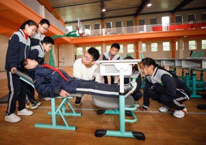 安吉第七小学的同学们正在调试午休桌椅