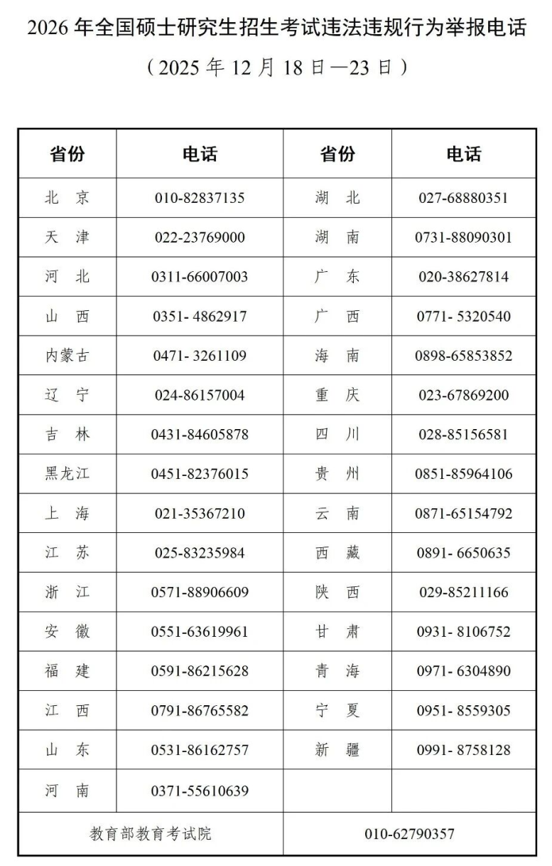 现向社会公布2026年全国硕士研究生招生考试违法违规行为举报电话,欢迎广大考生和公众参与监督。