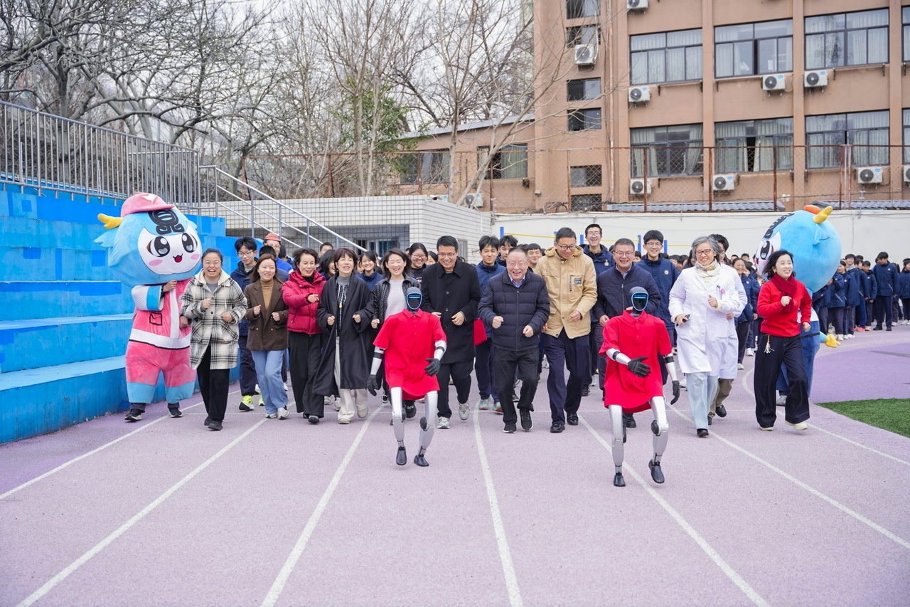 智能机器人带领大家一起做活力操并领跑彩虹跑,让科创为健康运动注入新动能。