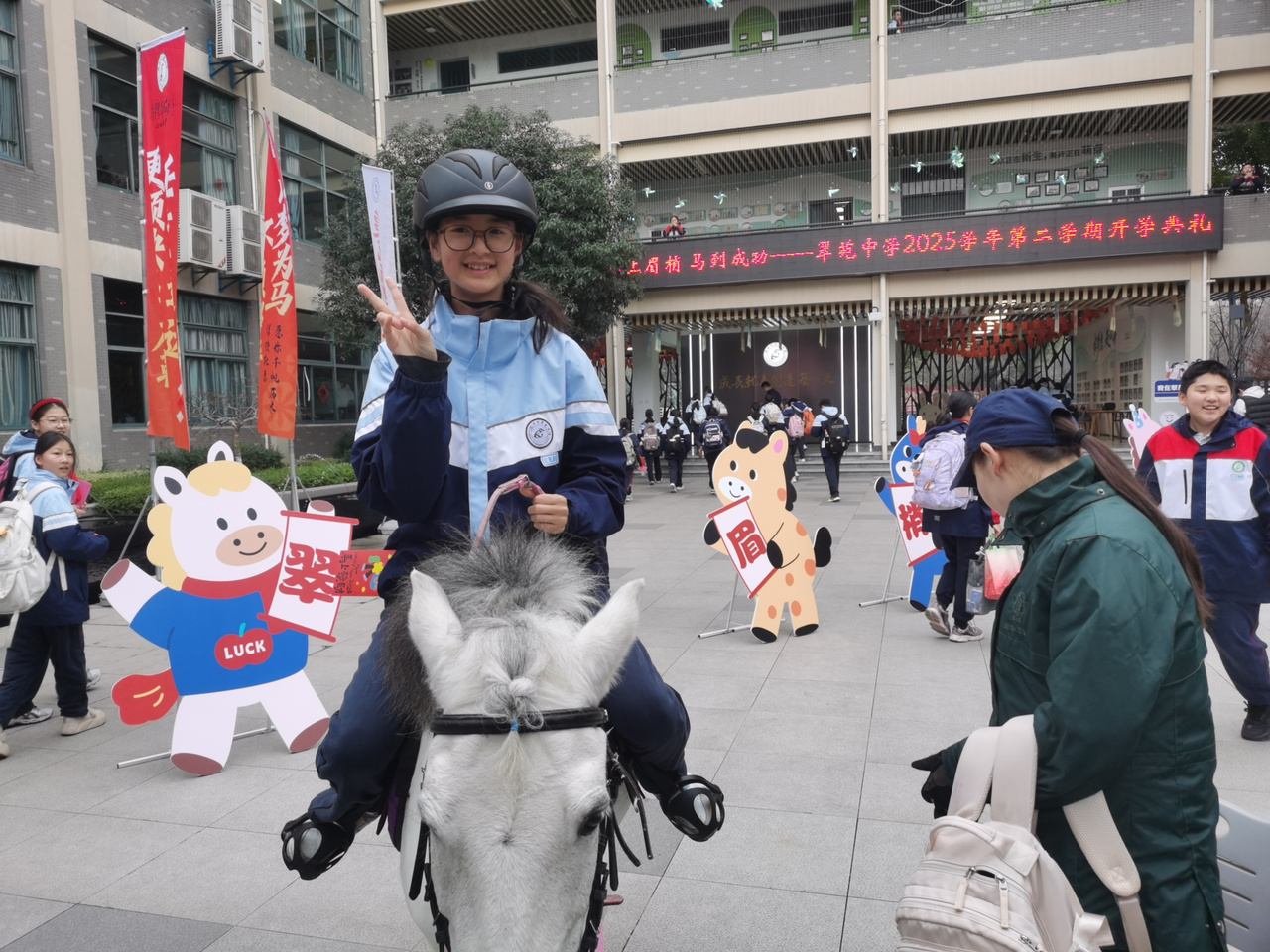 马年,马到成功。校园里,马元素也相当火爆,还有学校邀请了真正的小马嘉宾来迎接同学们。