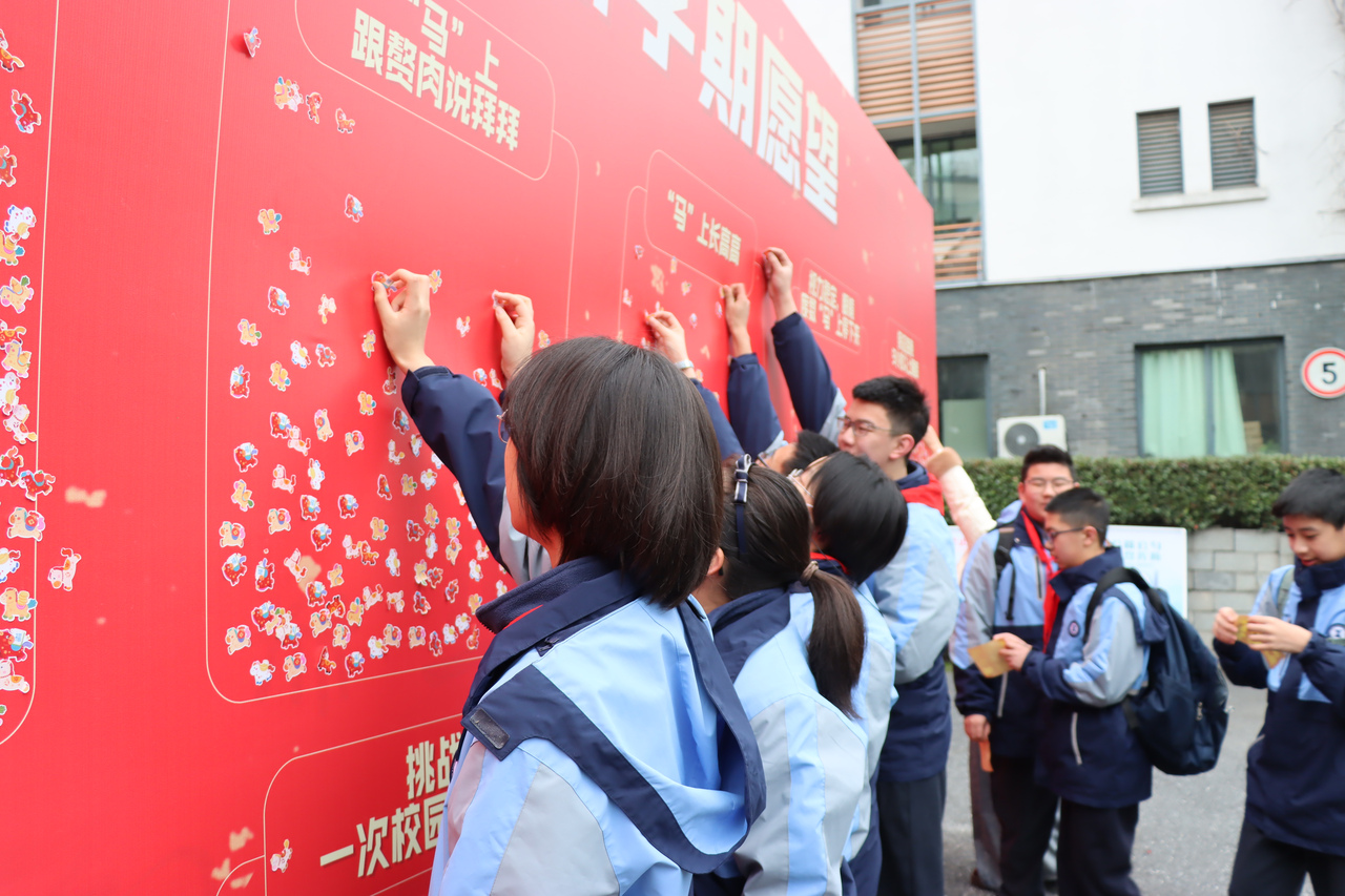 每位同学都能在校门口领取一只“幸运小马”,贴在“马年许愿墙”上。一面许愿墙,写下的不只是愿望,也是一份对自己的郑重承诺。