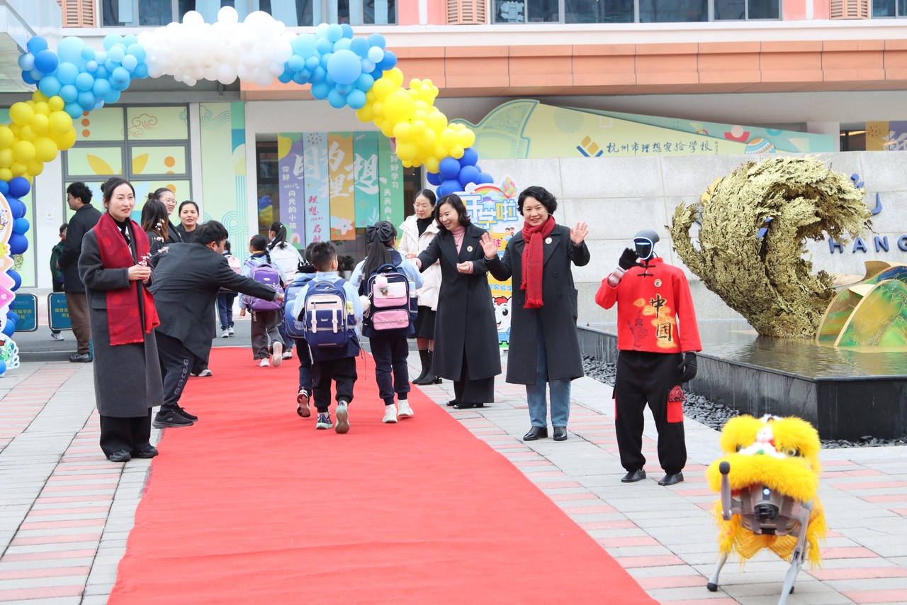 宇树机器人和“萌宠”机器狗热情助力,向每一位入校的孩子挥手问好,并送上满载祝福的新学期礼物。