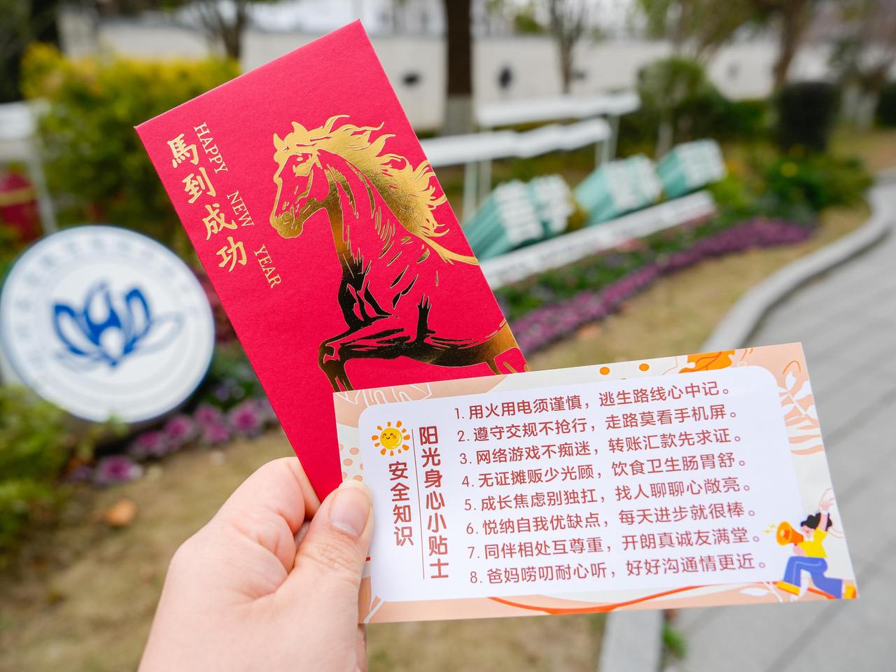 校领导为每一位学生送上新春红包。这份特别的红包里,不仅藏着“骐骥驰骋”心愿卡,更印有安全知识・阳光身心小贴士,从消防知识、交通安全到心理调适、同伴相处,8条寄语全方位护航同学们的身心大健康。
